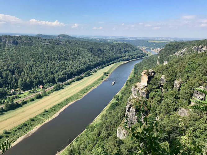 Vous êtes fan de la belle nature? Ensuite, cette excursion d’une journée aux trésors du parc national de la Suisse saxonne vous émerveillera. Faites-vous chercher confortablement le matin de votre hébergement avec une camionnette. Avec un petit groupe guidé, vous serez emmenés de Dresde au cœur de la région du canyon de l'Elbe.Le premier arrêt sera le magnifique pont Bastei du côté saxon (allemand) du parc national. Traversez le pont perché au-dessus de l'Elbe et laissez-vous surprendre par sa vue époustouflante.Savourez un déjeuner fantastique ensemble au parc national avant de descendre vers les gorges de Kamenice, où vous monterez à...